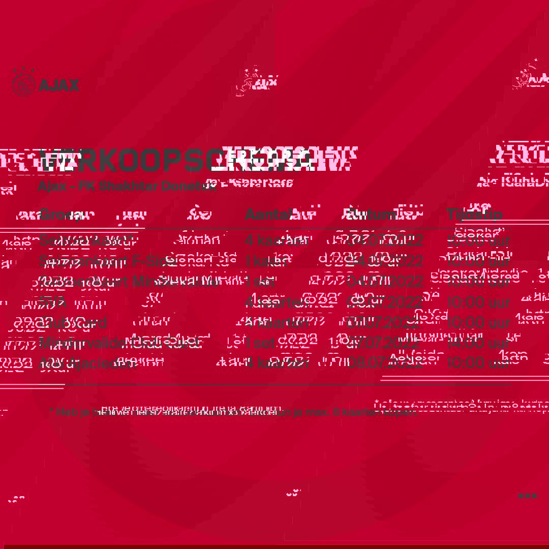 Hou er rekening mee dat je per seizoenkaart maximaal vier kaarten kunt bestellen. Heb je meerdere seizoenkaarten? Dan kun je maximaal acht kaarten bestellen. Na bestelling ontvang je uiterlijk twee dagen voor het duel je mobile ticket(s) in de Ajax-app.