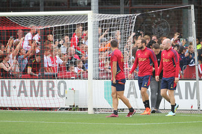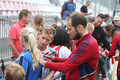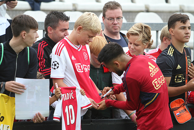Na afloop van de oefensessie namen spelers en trainers dan ook de tijd om selfies te nemen met supporter(tje)s. En om volop krabbels uit te delen. Dat gebeurde op Ajaxshirts, in handtekeningenboekjes, op meegenomen ballen en eh... Waar niet op eigenlijk?