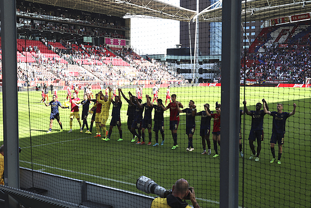 Dat was in het verleden wel eens anders. Maar goed, wij van Ajax kwamen voor de punten en de punten gingen mee naar Amsterdam. Alle drie. Dikke prima. Utrecht-uit kun je maar vast gehad hebben en een kundig Ajax won zakelijk. En dik terecht bovendien. Het vlagvertoon vanuit het uitvak was lekker om te zien.