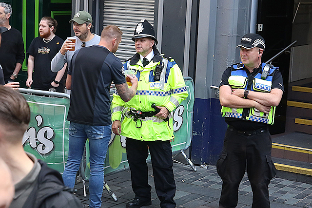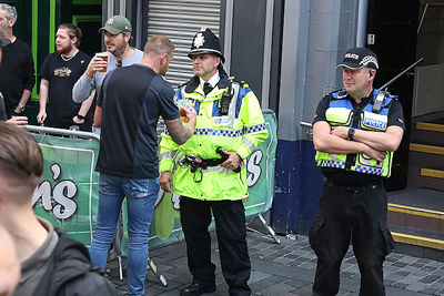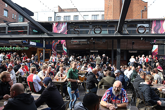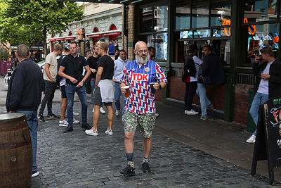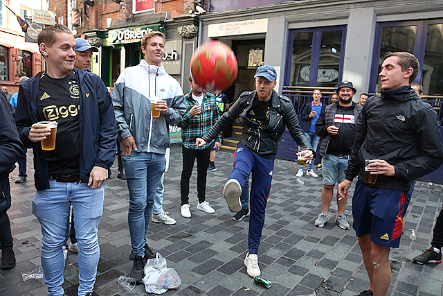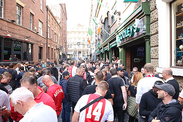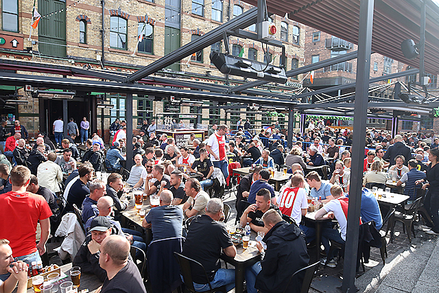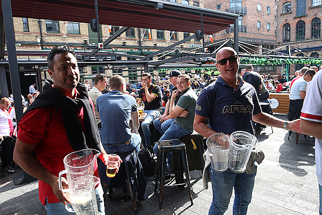 Waar we ook mazzel mee hadden? Het weer. Een dag voor de wedstrijd was er Britse regen, maar op matchday brak de lucht open. Dat zorgde voor gezelligheid in het centrum.
