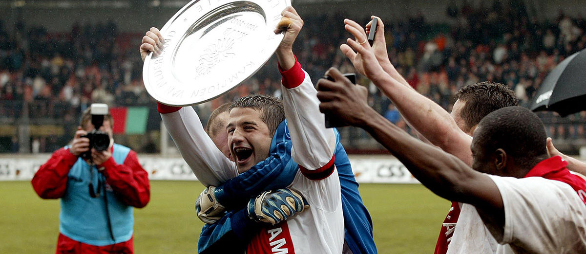 De klok tikt naar het eind. Ajax gaat kampioen worden. Het kan niet meer stuk. Natuurlijk is Chivu de man die de schaal krijgt uitgereikt. De schreeuw die volgt als hij het zilverwaar boven zijn hoofd heft, zegt eigenlijk alles. Kampioen in de modder van Nijmegen.