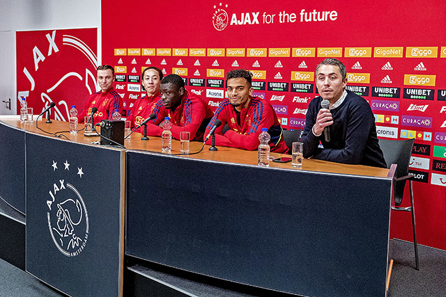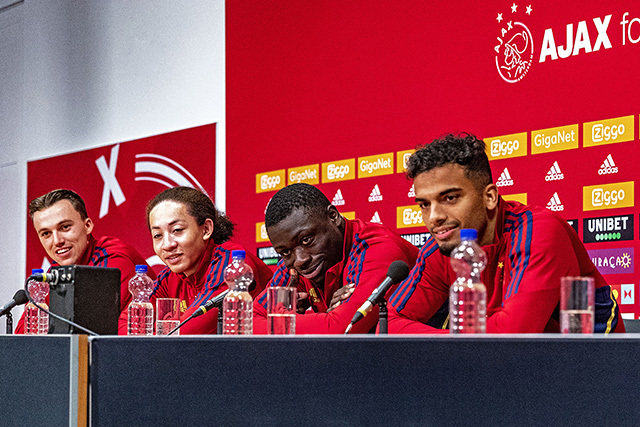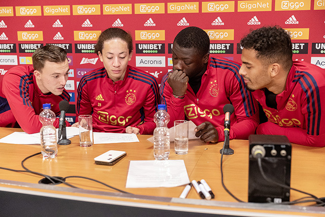 Na een uitstekende voorbereiding was het grote moment daar en werden Brian Brobbey, Youri Regeer, Kian Fitz-Jim en Owen Wijndal met een klaterend applaus ontvangen in de persruimte. Tijd om vragen af te vuren!