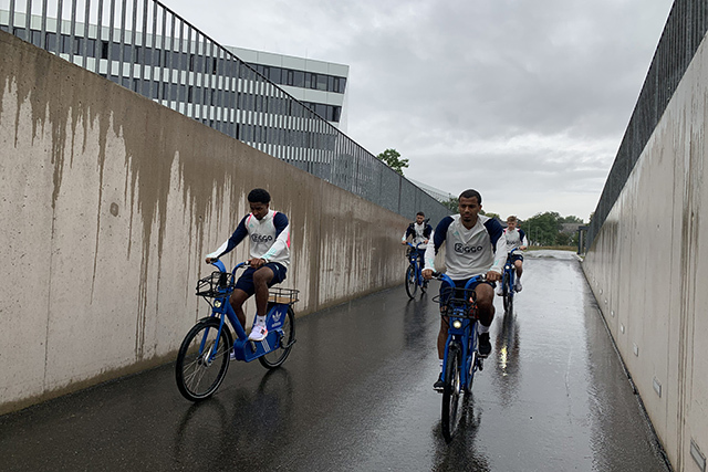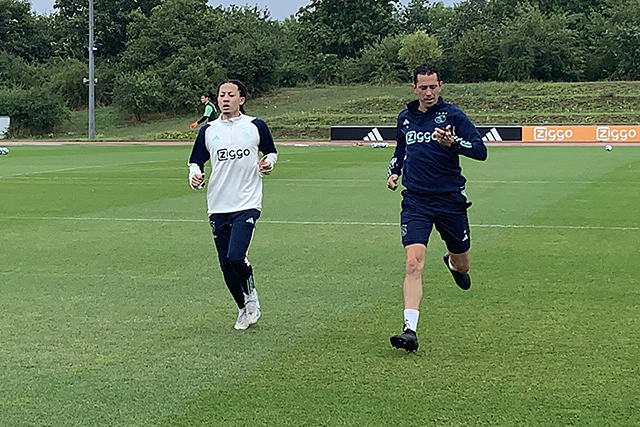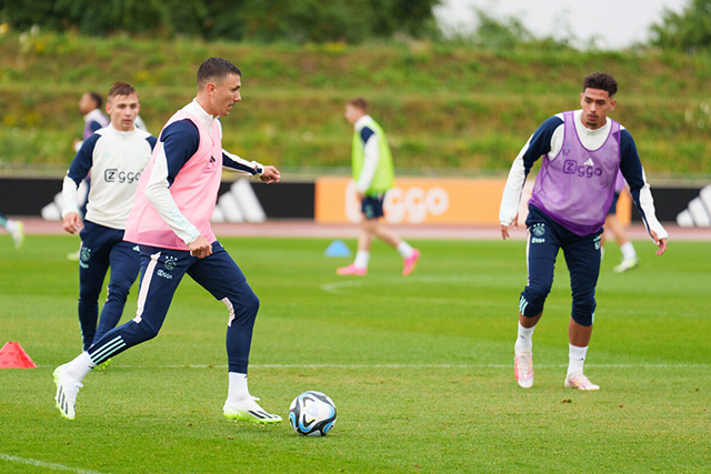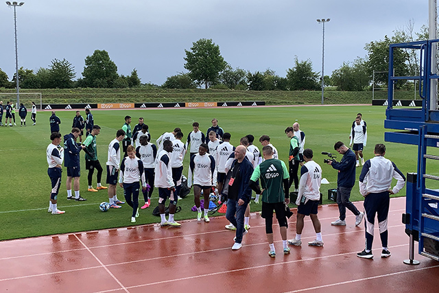 Je zou kunnen zeggen dat de ochtendsessie van Ajax in het water viel, maar dat zou niet terecht zijn. Ja, het regende pijpenstelen, maar de spelers hadden een uitstekende grasmat onder de noppen. Onweer bleef gelukkig achterwege, dus Maurice Steijn kon gewoon doen wat hij van plan was.