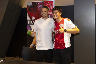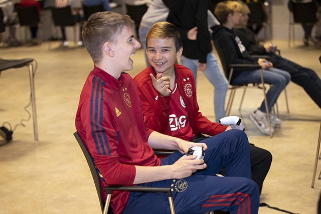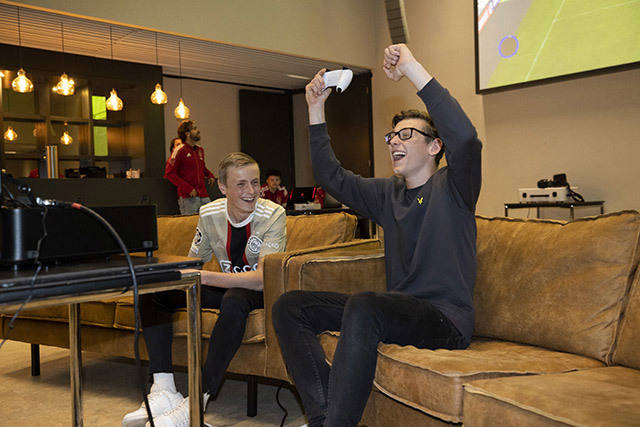 Nog gaver was dat ook Kenneth Taylor langskwam. Voor handtekeningen, selfies en een groepsfoto, maar ook om zelf de controller ter hand te nemen. De Ajacied bleek een waar Fifa-talent. Hij speelde drie potjes, waarvan hij er twee won en een gelijkspeelde.