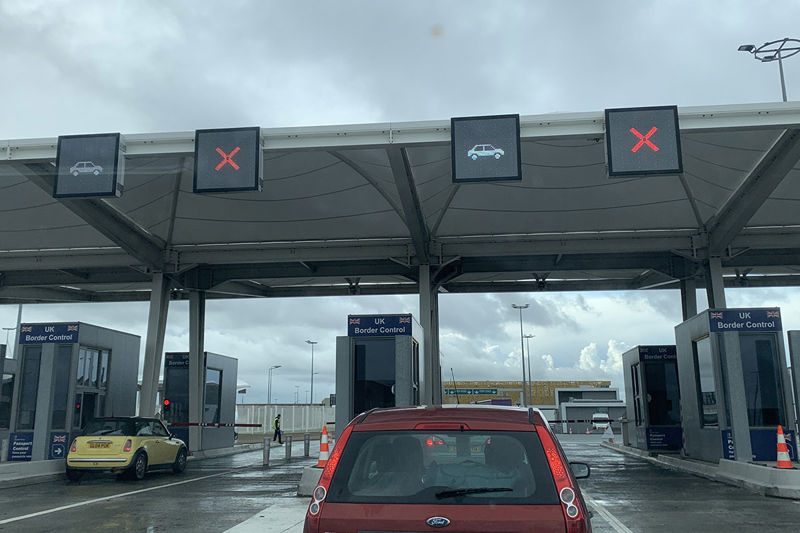 Rond 11.10 uur stuur ik mijn auto richting de bootterminal van Calais. Voor we verder mogen, hou ik stil bij een douanehokje. Daarin zit een heel chagrijnige beambte. Een verhoor volgt. Ze wil precies weten wat we komen doen en waarom. Me aankijken, lukt niet. Hoe vrolijk ik ook doe, er kan geen lachje af. Ik besluit lief te doen. Je hebt zo traangas in je bakkes. Het blijft toch Frankrijk, nietwaar?