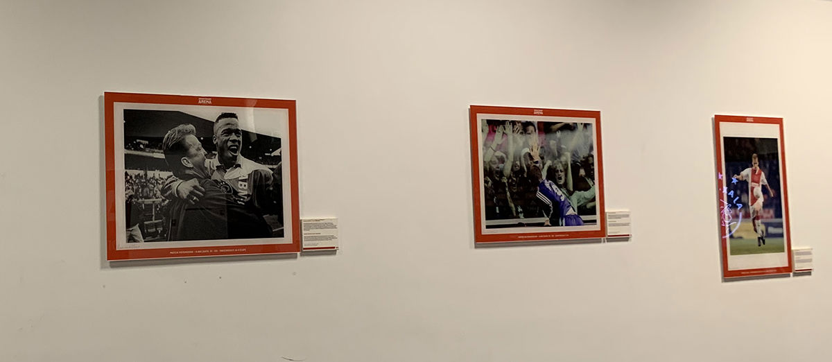 Louis van Gaal – die nu flink druk is met Ajax – kijkt eveneens mee vanaf de muur. Een geweldige zwart-witfoto, waarop hij een nog piepjonge Edgar Davids innig omhelst. Het Ajaxgeluk spat af van de wand. Richard Witschge houdt even verderop hoog tegen Feyenoord. In de perskamer spot ik zo veel meer Ajaxbranie dan binnen de lijnen.