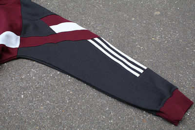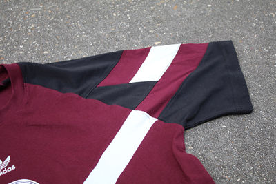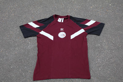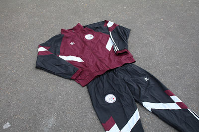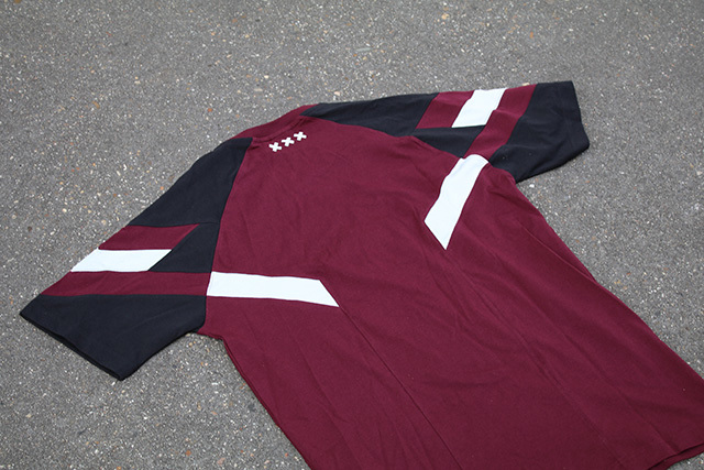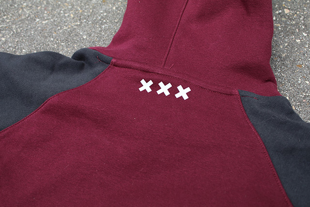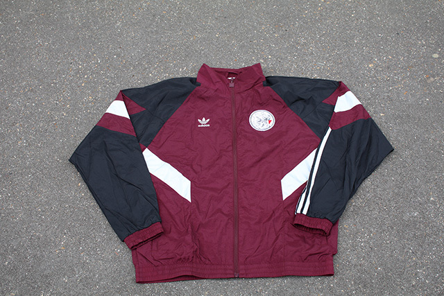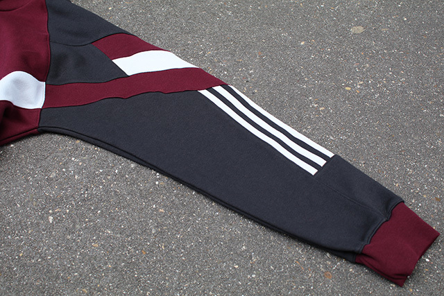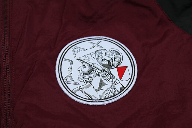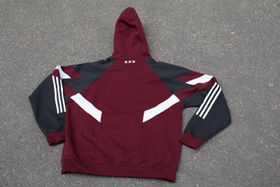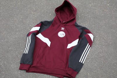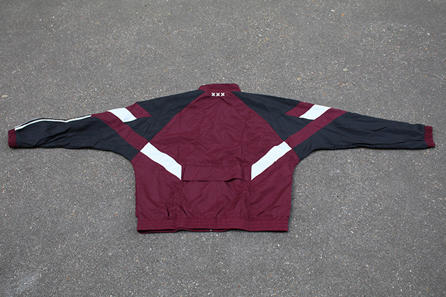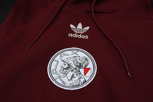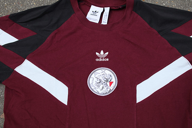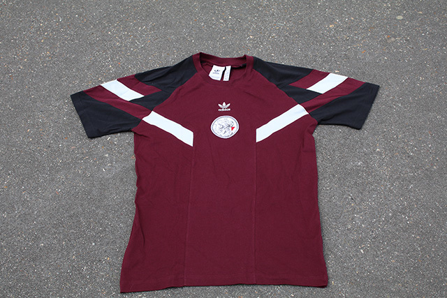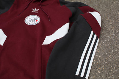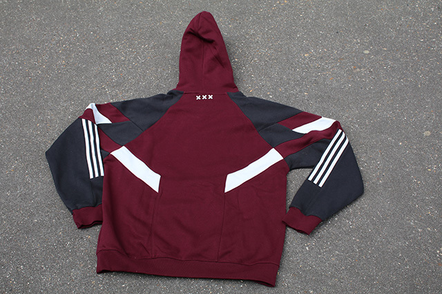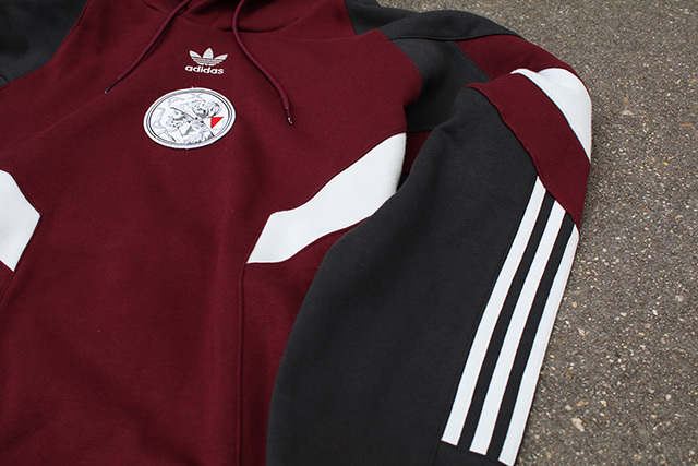 De hoodie, het t-shirt en trainingsjack zijn grotendeels donkerrood van kleur, met zwarte en witte vlakken in de zij en op de mouwen. Adidas noemt dit de retro three stripes style. Op de voorkant prijkt het klassieke Ajaxlogo en hier vinden we ook het oude Adidaslogo terug. De andreaskruizen in de nek zijn wit afgedrukt.