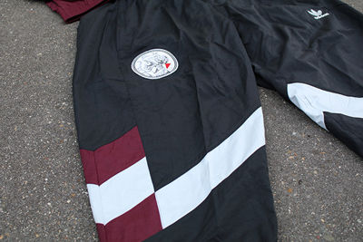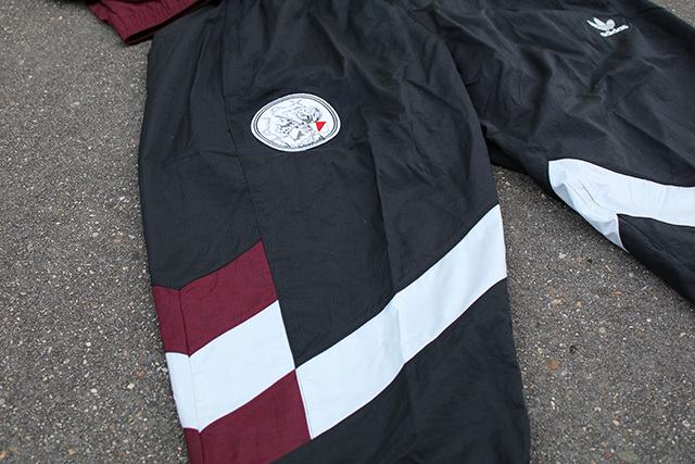 De trainingsbroek is zwart. Aan het uiteinde van de broekspijpen zijn de witte Adidasstrepen zichtbaar. Dit is ook het geval op de lange mouwen van het jack. Afijn, je kunt het beste zelf even naar de foto’s kijken. Dan krijg je een beter beeld.