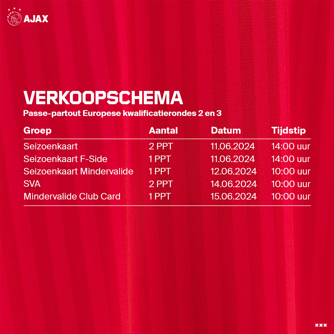 Passe-partouts zijn te koop vanaf 25 euro. Dat lijkt ons een heel schappelijke prijs voor twee thuiswedstrijden. Ajax kan dan ook alle steun goed gebruiken.