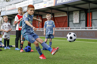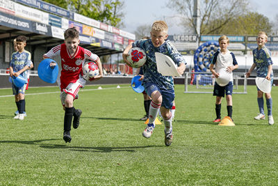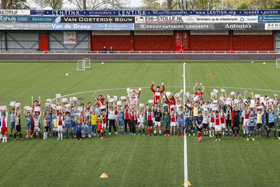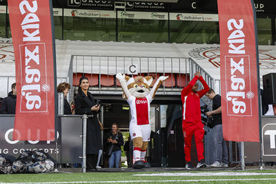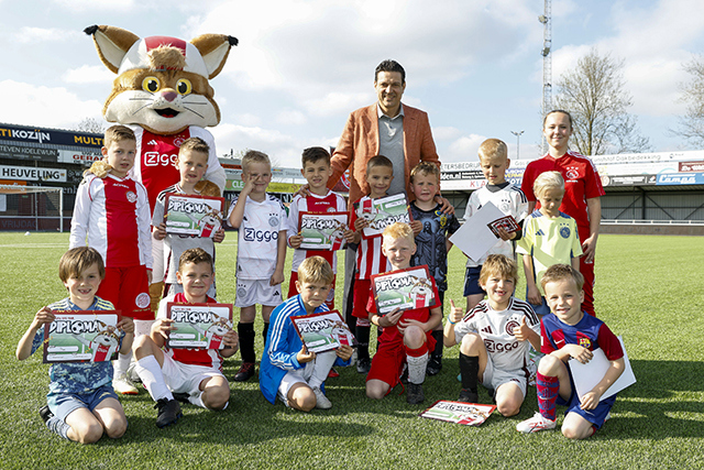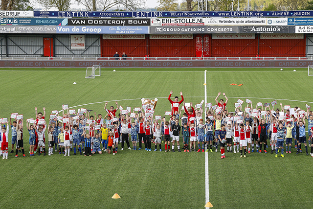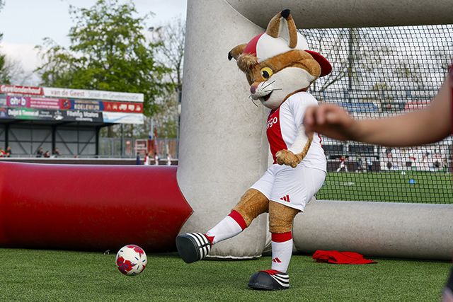Lucky trok vrijdag de voetbalschoenen weer aan. Dat gold ook voor 140 Ajaxsupportertjes. Het werd een heerlijke dag tijdens de Ajax Kids Tour bij IJsselmeervogels. En als verrassing kwam Jari Litmanen ook nog langs!