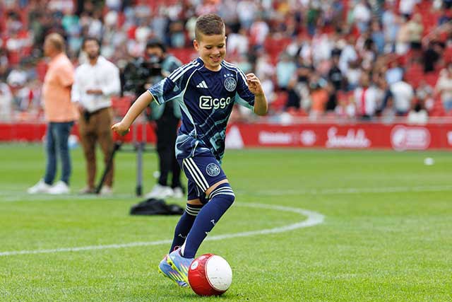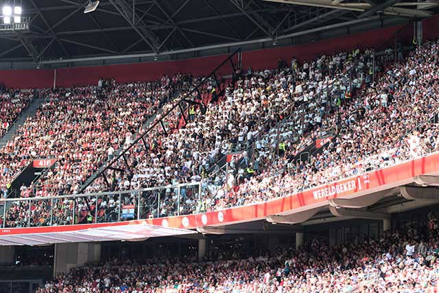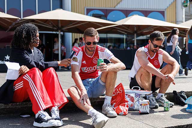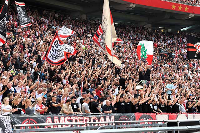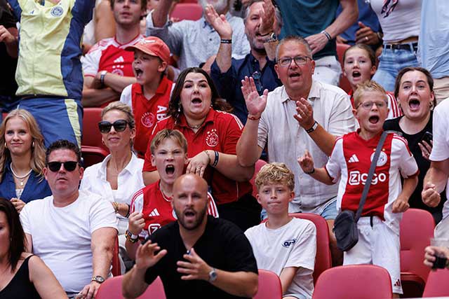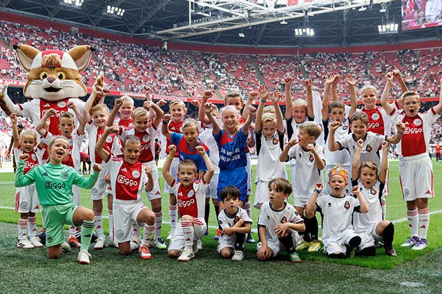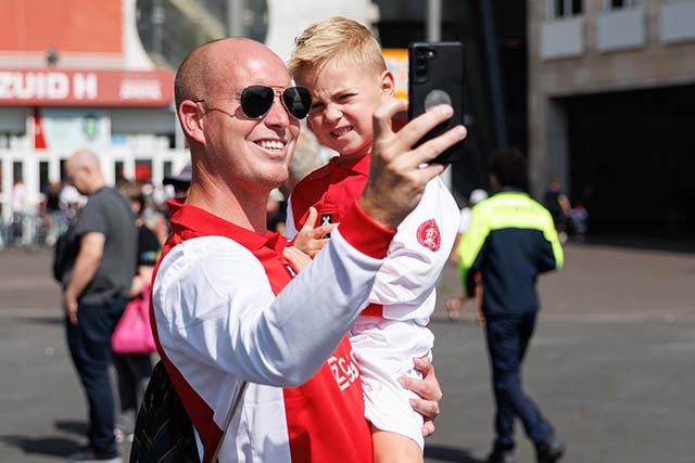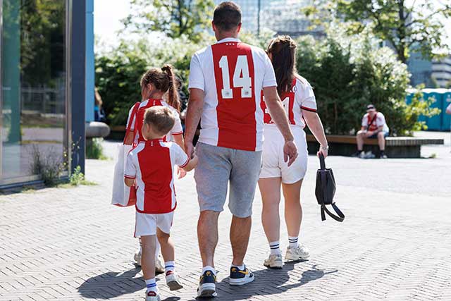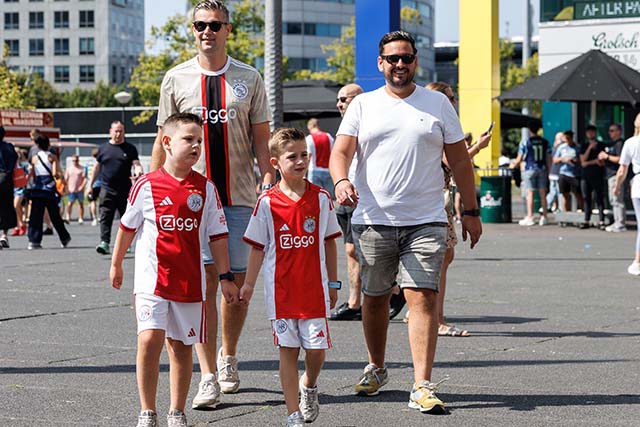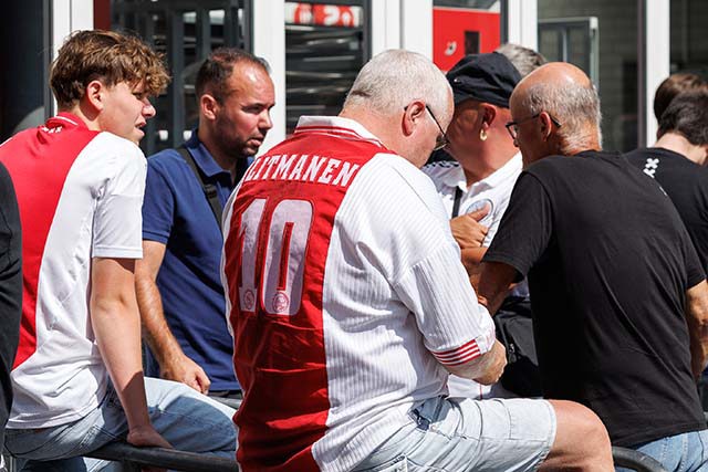 De zondag begon heerlijk. De zon scheen en de Johan Cruijff Boulevard kleurde al vroeg wit-rood-wit. Overal verzamelden Ajacieden zich voor de seizoensopener van onze mooie club. Lekker drankjes op het terras of fijn met blikjes bier op een stoepje. En wat zagen we veel jonge guppies aan de hand van vader, moeder, opa of oma. Mooi!