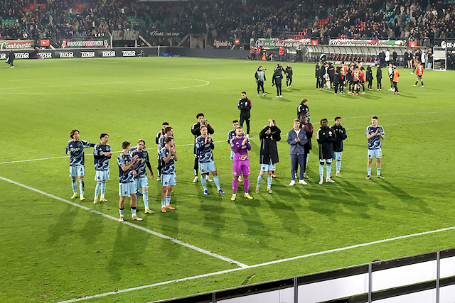 Vijfhonderd Ajacieden reisden zaterdag af naar De Goffert voor de laatste Ajaxwedstrijd van 2025. Ze zagen een Ajax matig voor de dag komen in het koude Gelderland. Het 2-2-gelijkspel tegen NEC zorgde er wel voor dat Ajax als nummer drie de winterstip in dook.