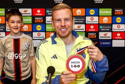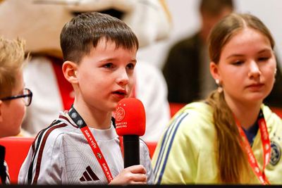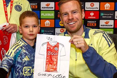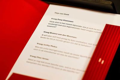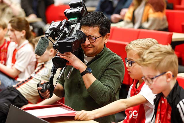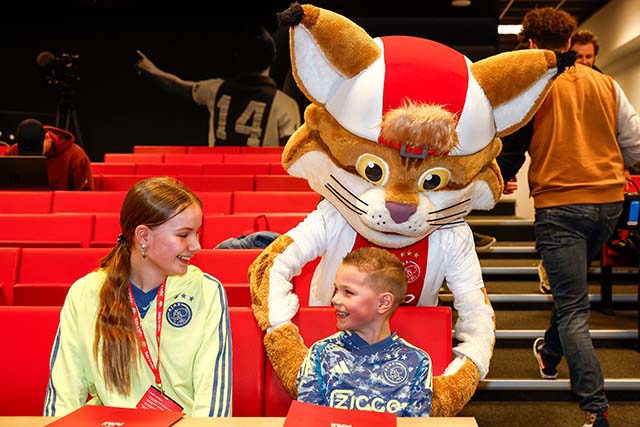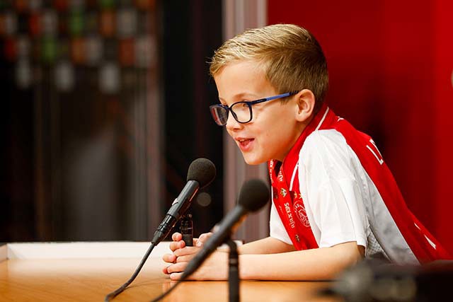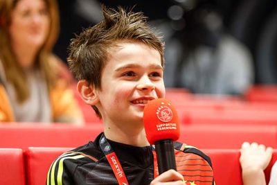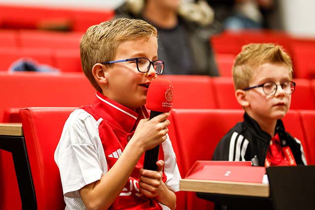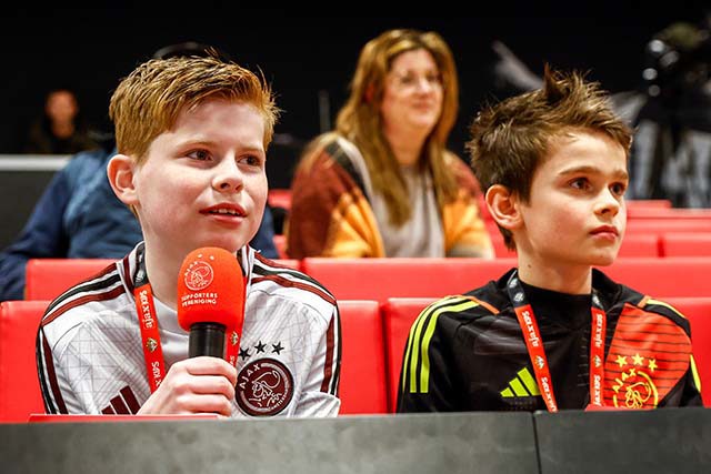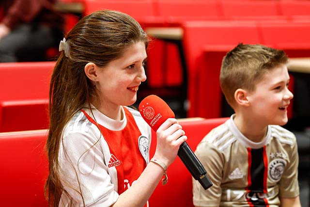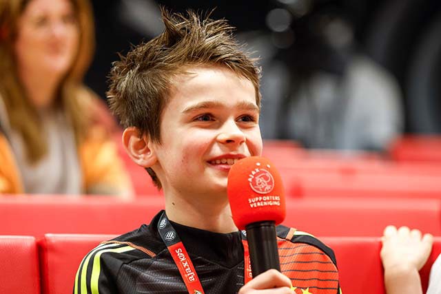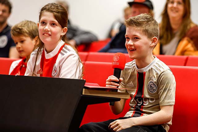 Kijk, dat zijn nog eens vragen! De jeugdige Ajacieden waren razend enthousiast en genoten er volop van in de huid van een echte journalist te kruipen. Eén deelnemertje slaagde er zelfs in Mokio aan het zingen te krijgen, terwijl een ander een cadeautje meebracht voor Klaassen. En Janse moest nogmaals beloven dat hij bij een kampioenschap van Ajax op de tractor naar het Museumplein komt.
