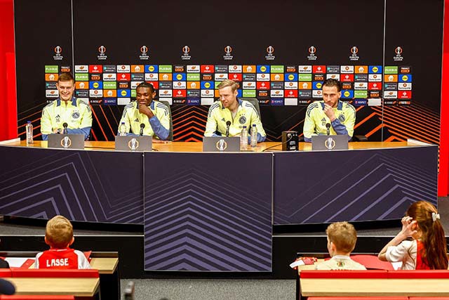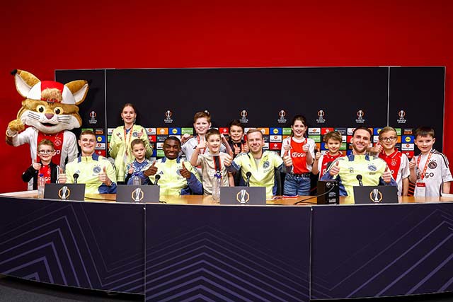 De allerleukste persconferentie van het jaar stond dinsdag weer op het programma. Negen razende reporters van de Ajax Kids Club vroegen hun helden het hemd van het lijf. Check snel de beelden!