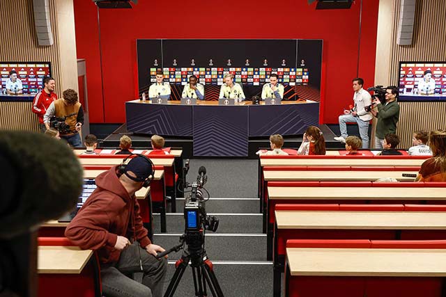 Gewapend met een schrijfblok en pen verzamelden de winnaars zich in de Johan Cruijff Arena. Na een toffe rondleiding door het stadion, mochten zij in de vernieuwde perskamer van Ajax aan de bak. Daar schoven Davy Klaassen, Jorthy Mokio, Branco van den Boomen en Dies Janse aan voor de Ajax Kids Club Persconferentie.