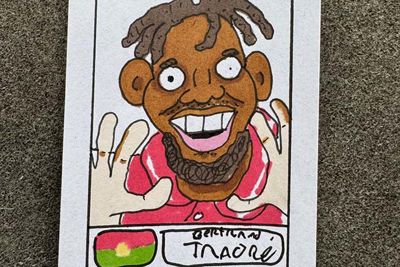 Stan tekent zijn portretjes eerst met potlood. Als hij tevreden is, trekt hij de lijnen over met pen. Hij kleurt de Ajacieden vervolgens in met stift. Dan knipt hij ze uit en klaar is het voetbalkaartje!