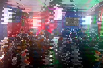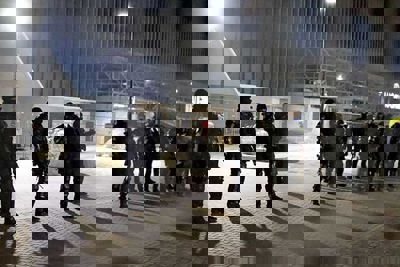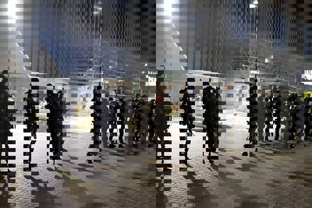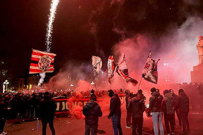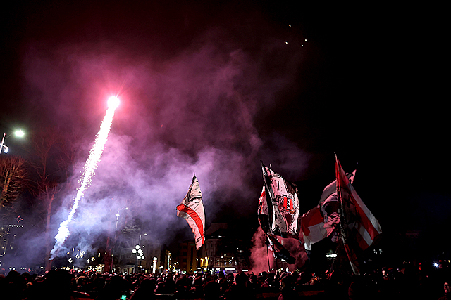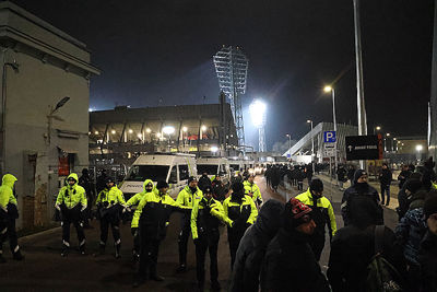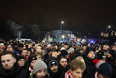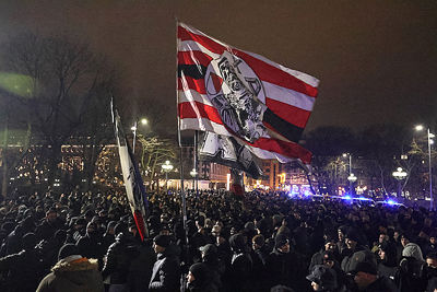Rond 19.30 uur was het zaak te verzamelen op het plein bij het Vrijheidsmonument. Daar begon de corteo richting stadion. In colonne een uurtje wandelen richting het stadion.
