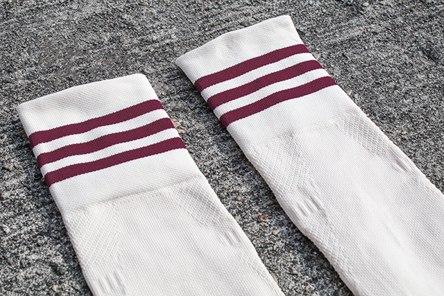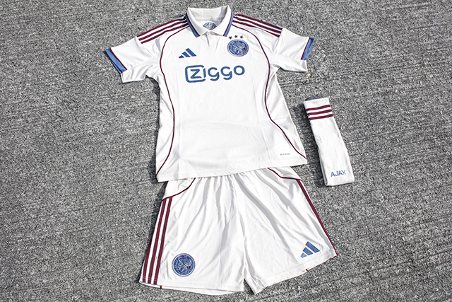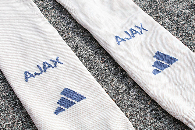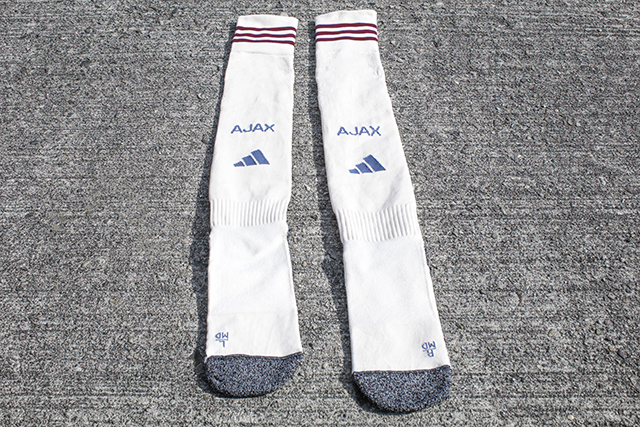 Het broekje en de kousen zijn eveneens beige en hebben dezelfde marineblauwe en bordeauxrode accenten. Bij bepaalde wedstrijden wordt gekozen voor een alternatief broekje en kousen, maar deze komen niet in de Ajax Fanshop te hangen.