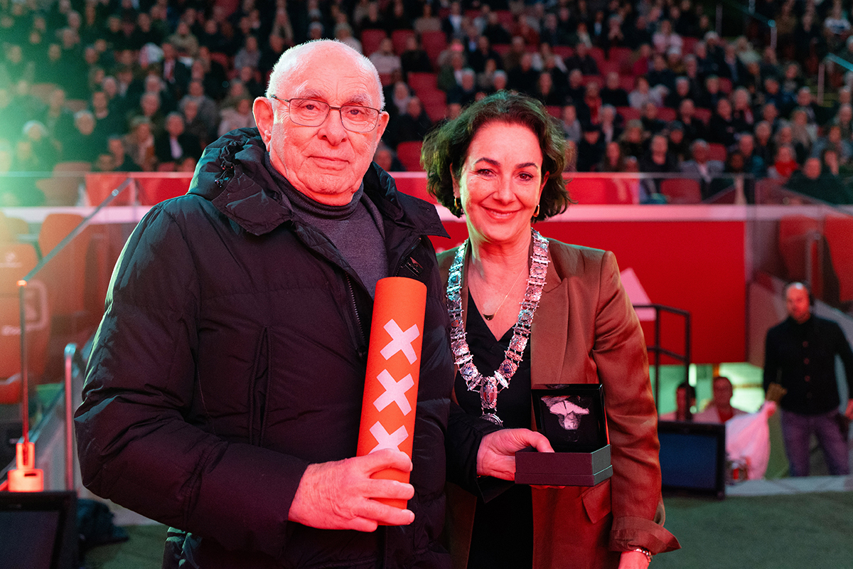 “Dat was mijn kleinzoon Mex van 14 jaar. Ik liep naar het podium en hoorde hem constant ‘Opa, opa’ schreeuwen. Ik heb twee dochters en een zoon. Mijn zoon Perry speelt bij Ajax op zaterdag in het derde amateurteam. Mijn kinderen waren er allemaal. Iedereen heeft goed zijn mond gehouden.”