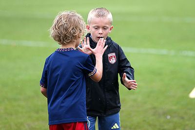In de loop van de ochtend verzamelde zich een bonte verzameling aan Ajaciedjes in de meest uiteenlopende Ajaxshirtjes. In de regen, dat wel. Vaders en moeders zochten lekker een plekje op de overdekte tribune, terwijl de kinderen het kletsnatte gras op mochten. Daar stond Lucky ze al op te wachten!
