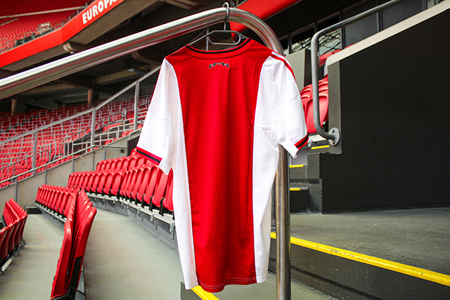 We zijn dik tevreden dat de wit-rood-witte baan niet wordt onderbroken bij de schouders. Ook op de achterzijde loopt de baan in z’n geheel door. Zoals het hoort. De bedrukking is uiteraard wit van kleur, met een rood en zwart lijntje eromheen. In de nek zien we een zwart symbooltje dat verwijst naar 750 jaar Amsterdam.