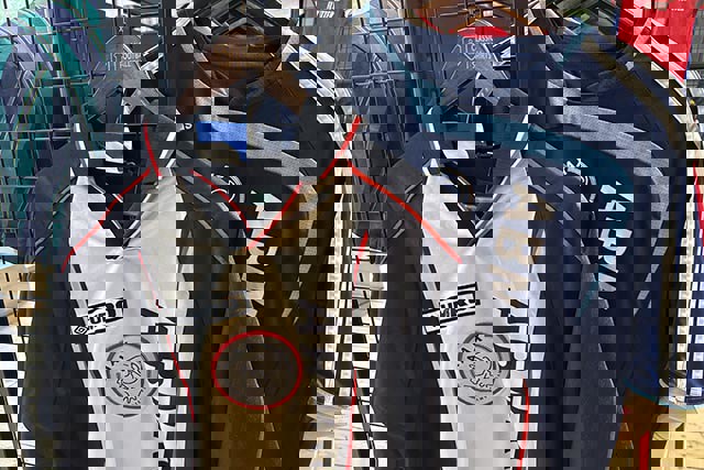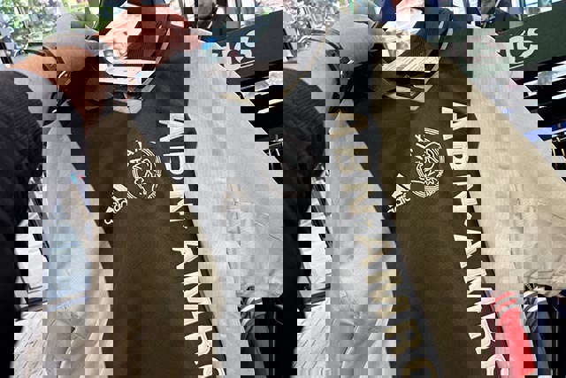 In de etalage is het meteen raak. Een grijs Ajaxuitshirt (seizoen 1996/1997) van Patrick Kluivert hangt naast een Chelseashirt van Glenn Hoddle. Jeetje! Eenmaal binnen gaat ons Ajaxhart een tikje of wat harder kloppen. We ontwaren een heel schap vol Ajaxshirts uit verschillende seizoenen.