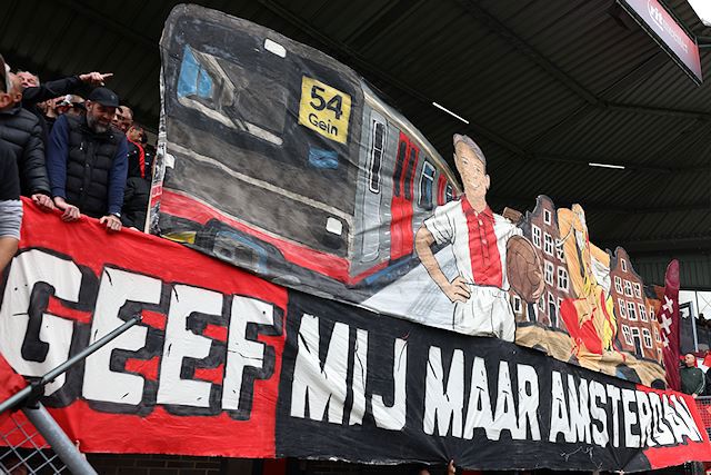 Al rap werd duidelijk dat er wederom een geweldige sfeeractie op stapel stond. De Ajacieden ontrolden een spandoek met daarop de tekst ‘Geef mij maar Amsterdam’. Het hele vak kleurde zwart-rood, de kleuren van de mooiste stad van Nederla… Eh, de wereld.