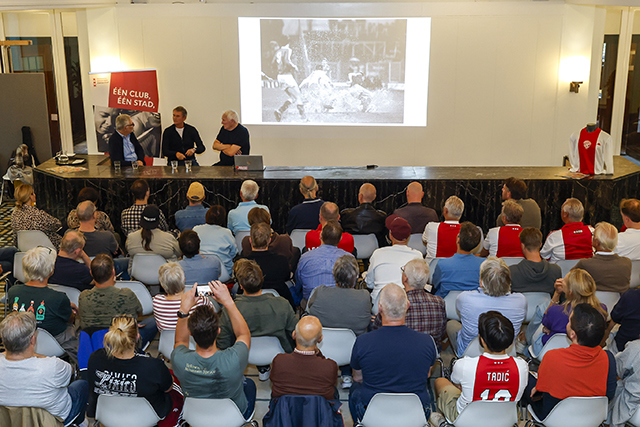 Ter ere van de vijfhonderdste officiële wedstrijd van Ajax in Europa – woensdag tegen Internazionale – kwamen in Stadsarchief Amsterdam twee gouden tijdperken samen. John Bosman en Gerard van der Lem waren onze gastsprekers tijdens een sfeervolle bijeenkomst, die helemaal in het teken stond van de glorietijden.