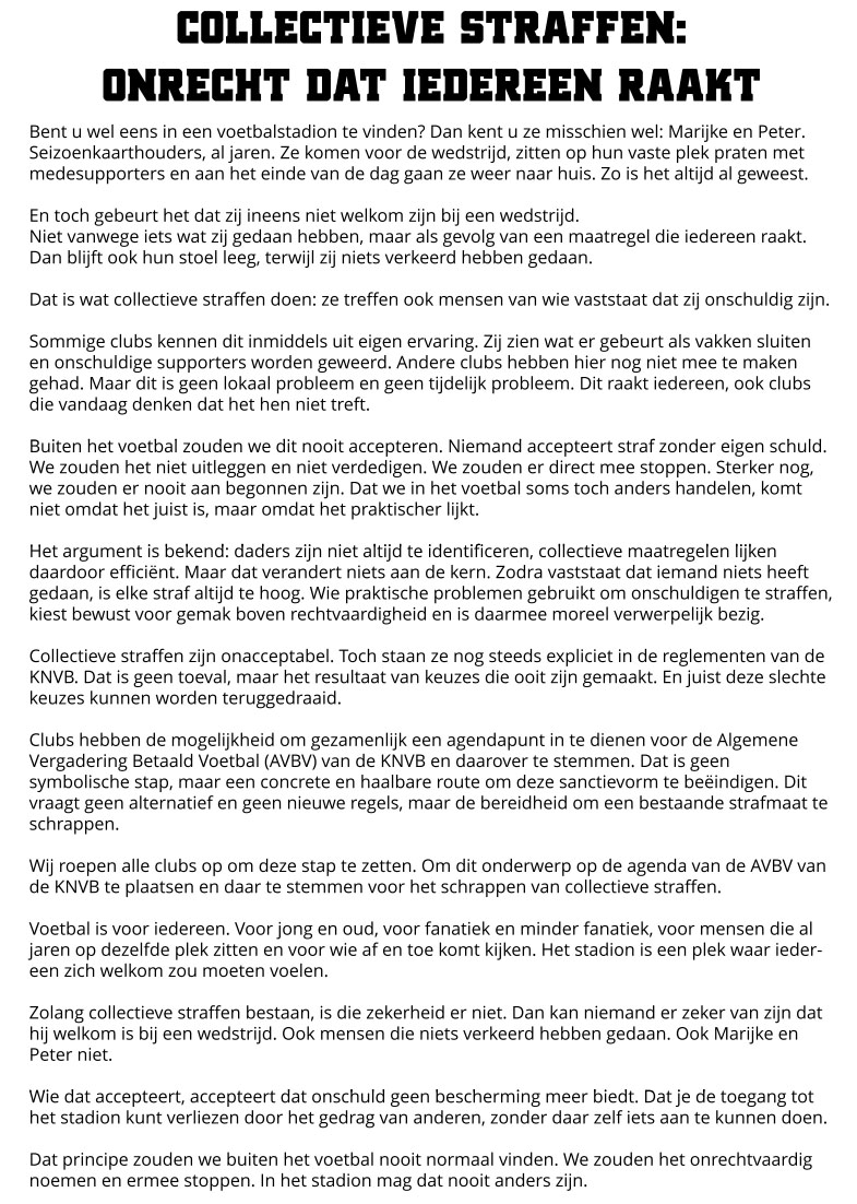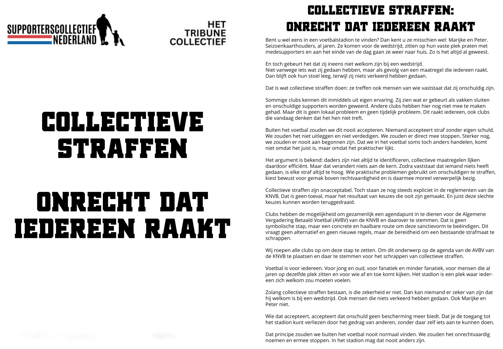 Collectieve straffen zijn simpelweg onacceptabel. Toch staan ze nog steeds expliciet in de reglementen van de KNVB. Dat is geen toeval, maar het resultaat van keuzes die ooit zijn gemaakt. En juist deze slechte keuzes kunnen worden teruggedraaid. Lees hier de volledige tekst.