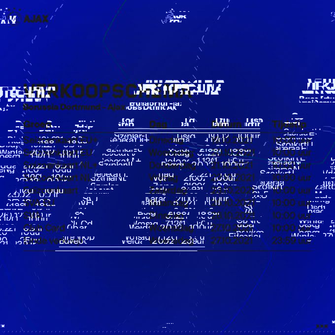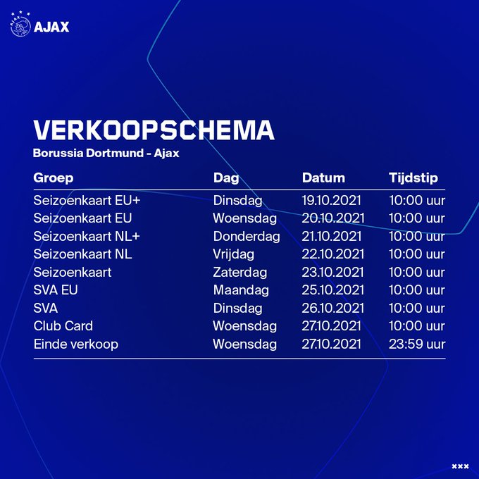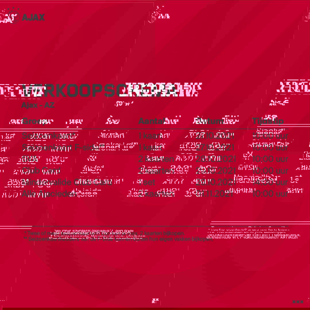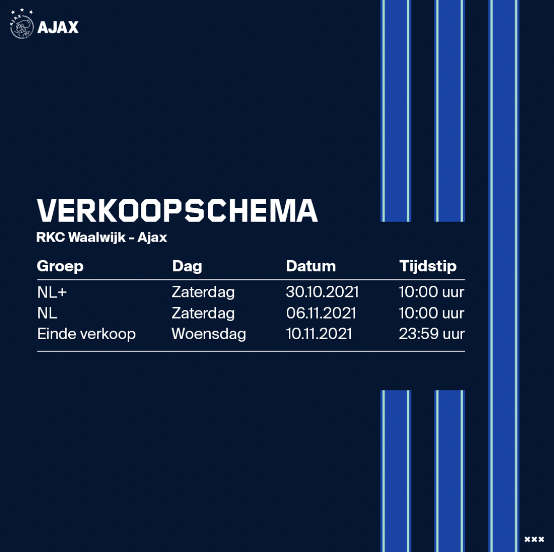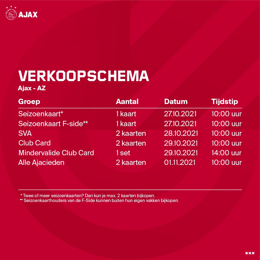 Voor ieder duel van Ajax wordt een verkoopschema gemaakt. In dit schema zie je welke doelgroep wanneer aan de beurt is om tickets te kopen. Er wordt eveneens aangeven hoeveel kaarten er per doelgroep kunnen worden gekocht.
